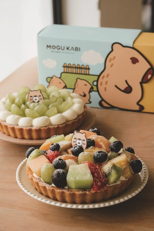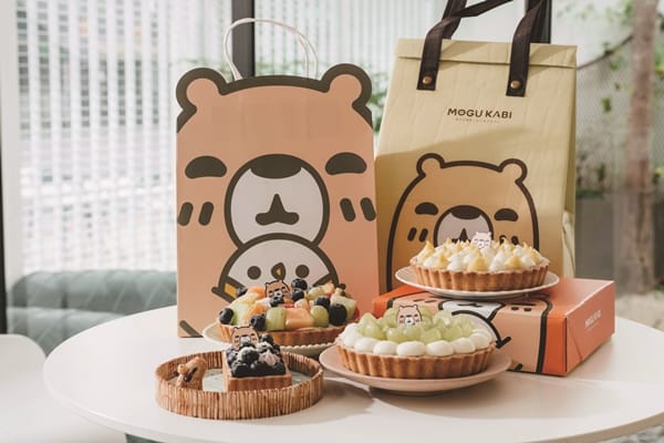 不僅甜點吸引,MOGU KABI豆塔延伸的周邊商品也大受歡迎,購買5.5吋水果塔系列商品或是加價購就送保冷袋,還有品牌帆布提袋、水豚T恤、防曬裙,上面都有呆萌水豚君吉祥物的卡通圖樣,就讓MOGU KABI陪伴您每一天。