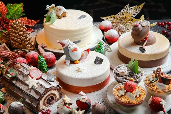 美味的甜品是耶誕大餐上不可或缺的甜蜜元素,今年由法籍點心行政主廚–裴洛偉負責主導規劃的「耶誕甜點村」共推出多款應景蛋糕點,首推三款以直徑約10公分的壓克力球體作為盛器,底座分別以草莓巴伐利亞、榛果蛋糕、巧克力慕斯為主體,再各別注入開心果香緹、榛果蛋奶醬、香蕉慕斯餡而成的「草莓巴伐利亞聖誕球」、「焦糖榛果聖誕球」,以及「巧克力香蕉慕斯聖誕球」,上方放著以巧克力捏塑而成的耶誕金球、可愛薑餅人與耶誕蘑菇村,成品充滿溫馨活潑的創意食趣,每顆280元。以原木造型呈現的「黑森林樹幹蛋糕」洋溢著微醺的酒漬櫻桃醬香氣,外圍裹以巧克力製成的樹幹外皮,主廚表示,歐洲家庭的傳統是保留一小塊今年度的木頭,當作來年生火的火種,代表光明的生生不息,也讓這款甜點於節慶感外更增添了寓意。另一款「雪白紛紛草莓戚風蛋糕」則是於草莓戚風蛋糕上,點綴可愛的小薑餅屋及麋鹿,優雅呈現雪白的耶誕氛圍。
