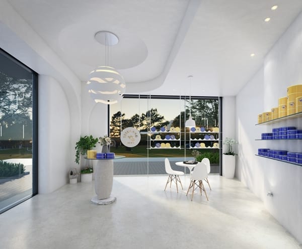 「COOKIE 886」竹北店為呈現品牌純粹與美好的精神,店裝設計以象徵天然麵粉的白色為主調,萃取出特有的擠花稜線、風吹流動的弧度,以CNC 3D立體加工與特殊塗料技術,呈現出鬆酥卻又滑順的質感與口感。另外,沈浸式全開放設計,讓人走訪其中便能自然感受品牌精神與製餅的過程,再融入風旋、浮雲吊燈、麵粉袋桌、放大95倍的巨型曲奇中島等裝置藝術,將COOKIE 886 曲奇餅的形、色、質感、口感、香味完全傳遞,透過全新的視角,帶領每一位訪客來到另一種美妙的靜止時光。