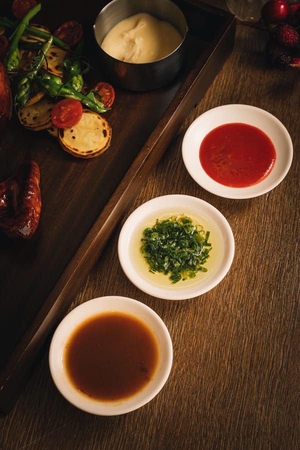 烤雞組同步附餐奶油馬鈴薯泥、烤季節食蔬,搭配3款獨家調和法式雞肉肉汁、中式蔥油醬以及辣醬做使用。