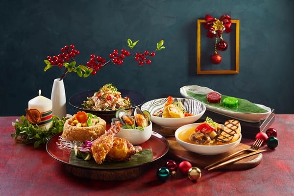 上述三天晚餐時段推出的豐美佳餚,由台北遠東飯店大馬華裔主廚黃愛珍和餐廳主廚楊能沛聯手設計,每人NT$1,599元,七道式美饌包括越式雞絲沙拉、越南鞭炮蝦、馬來西亞牛尾湯附麵包、印尼薑黃炸雞佐參峇醬、娘惹酸辣翡翠貽貝、佛缽蔬飄香、和馬來西亞紅龜粿,香料領軍鮮美適口,酥脆軟彈各擅勝場,為佳節譜寫有滋有味的美好回憶!