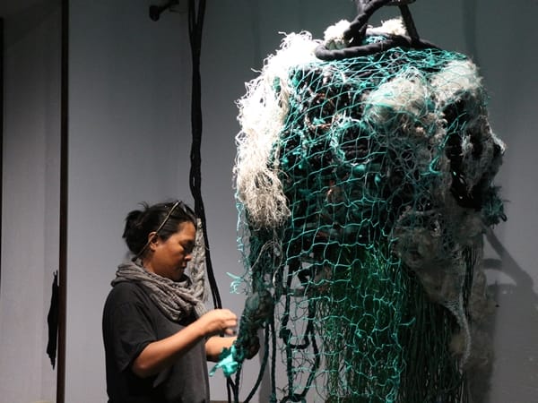 「例如 2018 年的駐村藝術家撒部.噶照(Sapud Kacaw)來自花蓮港口部落(Makotaay),本身就是南島語族一員,長期關注環境議題的他,看見原住民賴以維生的海洋遭受汙染,因而以大量海洋垃圾廢棄物創作裝置藝術,突破了傳統創作媒材的框架。」