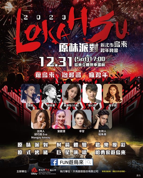 12月31日(六)新北市烏來區跨年晚會——「LOKAHSU原味派對」活動,更盛情邀約大家一起來迎接2023年,跨年必備的音樂、煙火饗宴之外,更有泰雅文化展演、原式烤豬、射箭體驗和多樣3C、家電……等好禮的摸彩活動增添歡慶氣氛。精彩表演自17:00展開,即有一系列的泰雅歌舞表演登場,眾實力派原民歌手——贊薇、胡采書、張心傑、曾宇辰、安歆澐接連獻聲,以及屢獲國際電影獎肯定、今年最動人國片《哈勇家》的演員——小薰、辛甘到場與大家相見,雙主持人由鯰魚哥、邱巧筑搭檔,與大家共度一場原味派對,迎接新年的到來。不同於全國各地熱鬧的跨年晚會,主打烏來泰雅樂舞演出的「LOKAHSU原味派對」活動,充滿人文情懷,「LOKAHSU」是泰雅族的招呼語「你好」的意思,活動以「LOKAHSU」為名,正是以道地原味歡迎賓客到訪的號召。
