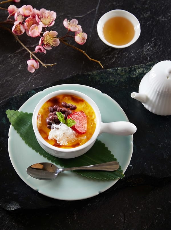 阿裕主廚說這本是茶樓的傳統甜品,但因製程要煮要烤,有些繁複,現在也不多見。他用三花奶水把糖和安加奶油融化後,便陸續加入已煮好的透明西米、摻了雞蛋液的芡水和卡士達粉,小火慢煮,充分拌勻,成為濃漿,將之盛入小盅一半高度,加點蓮蓉餡,再繼續補滿漿體,即可烤製成西米布丁,待客人點用時,盅面加點燕窩回烤上桌,溫熱香濃,迎接冬季剛好。