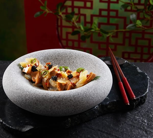 將蜇頭和紅燒風味8頭鮑各自費時發泡、蒸軟後,改刀分切裝盤,加入蔥花、辣椒,潑熱油爆出香氣,再拌糖醋汁、並飾以法國百年頂級品牌Punier的鱘龍魚子醬,入口好似洋海氣息濃縮,鹹鮮沖盪舌尖!