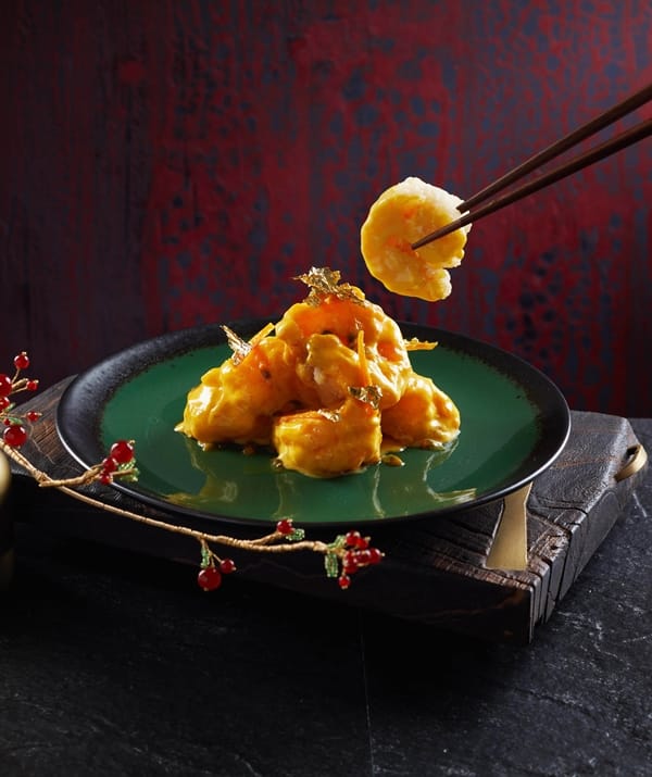 也是道夏宮名菜!主廚先用芒果醬、檸汁、美乃滋和煉乳,調成蝦球醬汁,就幫大明蝦開背,醃出底味,再加蛋黃、生粉裹身後,猛油炸熟瀝乾,即可調拌醬汁裝盤,再用金箔、芒果條裝飾,經典老菜,魅力依舊!