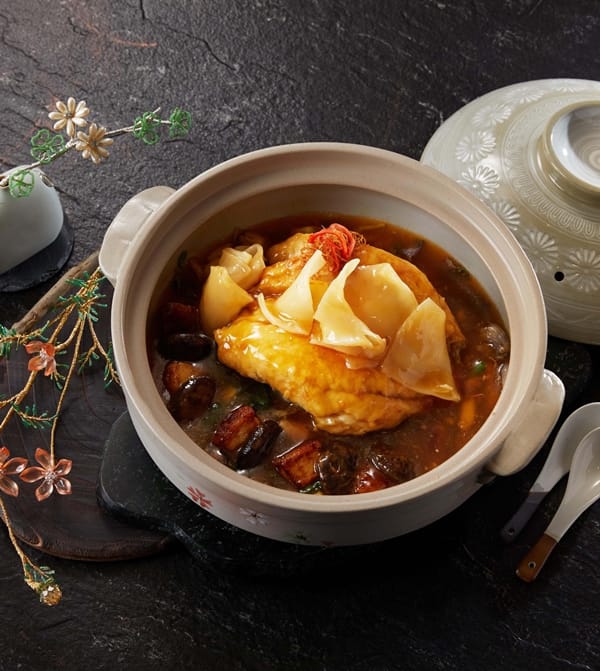 取湯盅注入上湯,陸續放入焯水洗淨的去皮雞腿肉,以及前述的燕盞和瑤柱,入籠蒸燉二小時,最後半小時才放上花膠,然後淋點紹酒加蓋上桌,金澈靚湯、燙口噴香,原料交融、鮮潤迷人,經典燉湯,一試便知!
