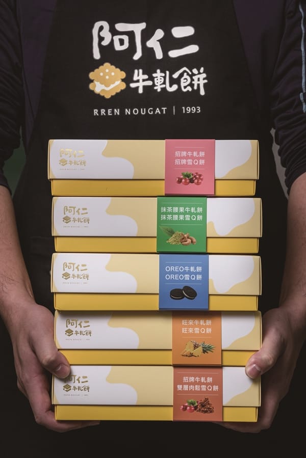 三年前從韓商企業出走,從不會開瓦斯的年輕老闆邱述仁轉戰食品業,一心想要做出代表台灣在地最好吃的牛軋餅,他覺得市面上的牛軋餅大都以麥芽糖為基底,口感較硬又易黏牙,雪花餅又太甜,常讓人無法吃第二塊。於是他努力鑽研,每天都花上近12小時熬煮牛軋糖,特選成本較高的棉花糖、美國進口的蔓越莓果乾,初期在FB粉絲社團販售,迎來好口碑,爆紅的「阿仁牛軋餅」沒有退燒,持續穩健成長,一天可熱銷2000至3000多包。