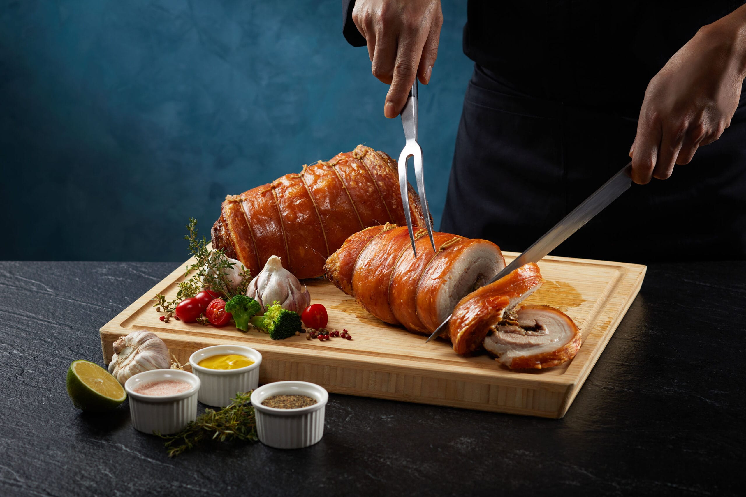 現切肉檯除了老饕最愛的爐烤美國牛肉之外,主廚還加碼首度推出「脆皮香料豬五花」,每片重達一斤的厚實帶皮五花肉,先花上半天鹽滷沁味,再畫刀,均勻抹上混入蒜頭、杜松子、黑椒、新鮮百里香的綜合香料,捲起綁妥棉繩,再醃12小時,才入烤箱費時烤出皮酥肉嫩、鹹香撲鼻的超好吃肉捲,利刃切片,肉汁汩汩流出,油潤香脆,也可搭配芥末醬或辣根醬佐食,熱辣上身,真是應景的禦寒美食!
