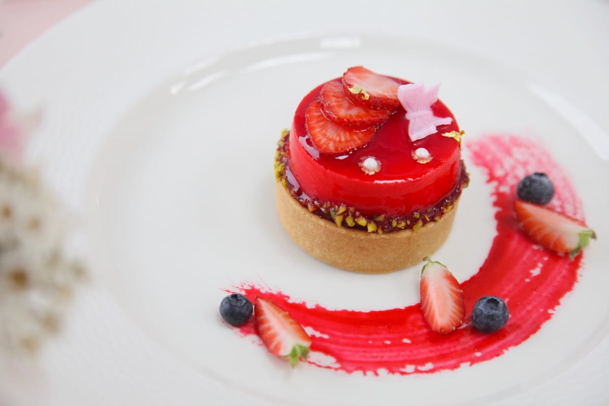 此外一禮烘焙特選當季酸甜適口的新鮮草莓推出「草莓玫瑰塔」售價860元,內餡幕斯嚴選埔里手工玫瑰花醬與草莓果泥調製,並附帶手工熬煮的覆盆子醬汁,以法式蛋糕鏡面淋醬的手法設計,將蛋糕包覆後再以開心果碎、法芙娜巧克力裝飾點綴,並搭配自製的派皮底座,讓口感保有幕斯的軟嫩與塔皮的酥脆。