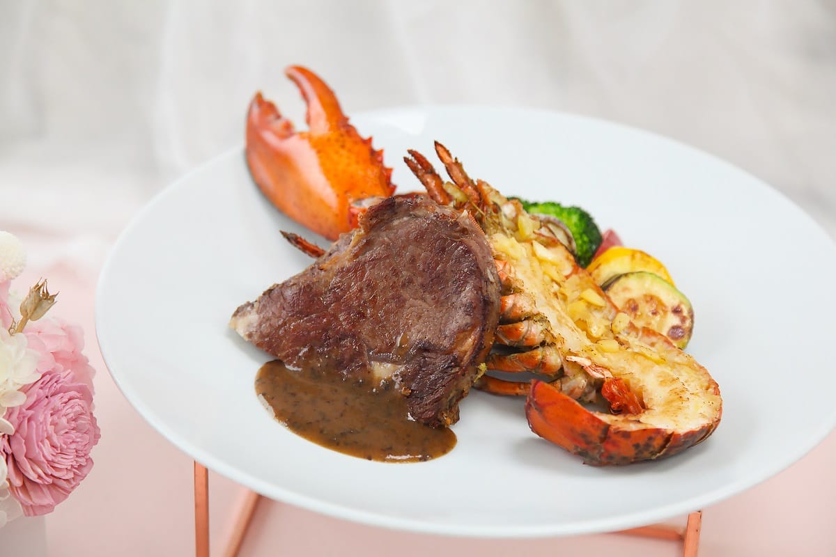 以主廚細膩手法展演頂級情人節饗宴,The Lounge大廳酒吧「臻情久久」情人節套餐,每位售價2,099元+10%,全套內容包含精緻滿分的「莓果燻鮭魚捧花沙拉佐玫瑰油醋醬」、極致奢華「波特酒慢燉牛舌搭嫩煎孢子甘藍」、「酥炸廣島牡蠣曼哈頓巧達湯」,以及嚴選「5盎司網烤杉河農場自然牛沙朗及半隻蒜味奶油燒烤波士頓龍蝦」的牛排、海鮮雙主菜,再搭配精選一禮烘焙麵包、檸檬雪酪、草莓玫瑰塔及飲品。每位享受美饌的賓客還可以優惠價399元,加購一禮莊園永生花束「紫色戀人」,讓幸福氛圍延續下去。