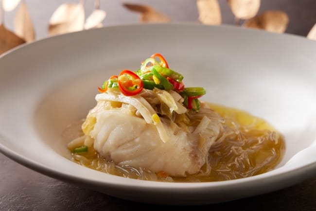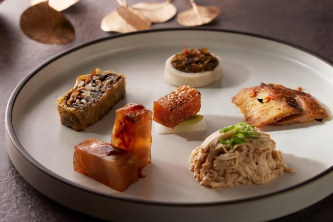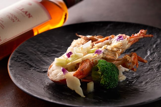 由請客樓主廚許宏德以細膩刀工打造「悅迎臻品六彩盤」招牌小菜組為晚宴揭開序幕,選以富含膠質花膠入饌的「雲腿濃湯燉花膠」潤喉、感受濃郁滑順口感。「燒酒龍蝦麻油飯」以純正黑麻油爆香老薑所煸出的迷人薑香後,將麥卡倫威士忌入菜,待酒氣揮發後再加入越光米拌炒,以及肉質彈牙的迷人鮮美龍蝦入饌,讓麻油香、香甜海味與酒香完美融合呈現絕妙滋味。