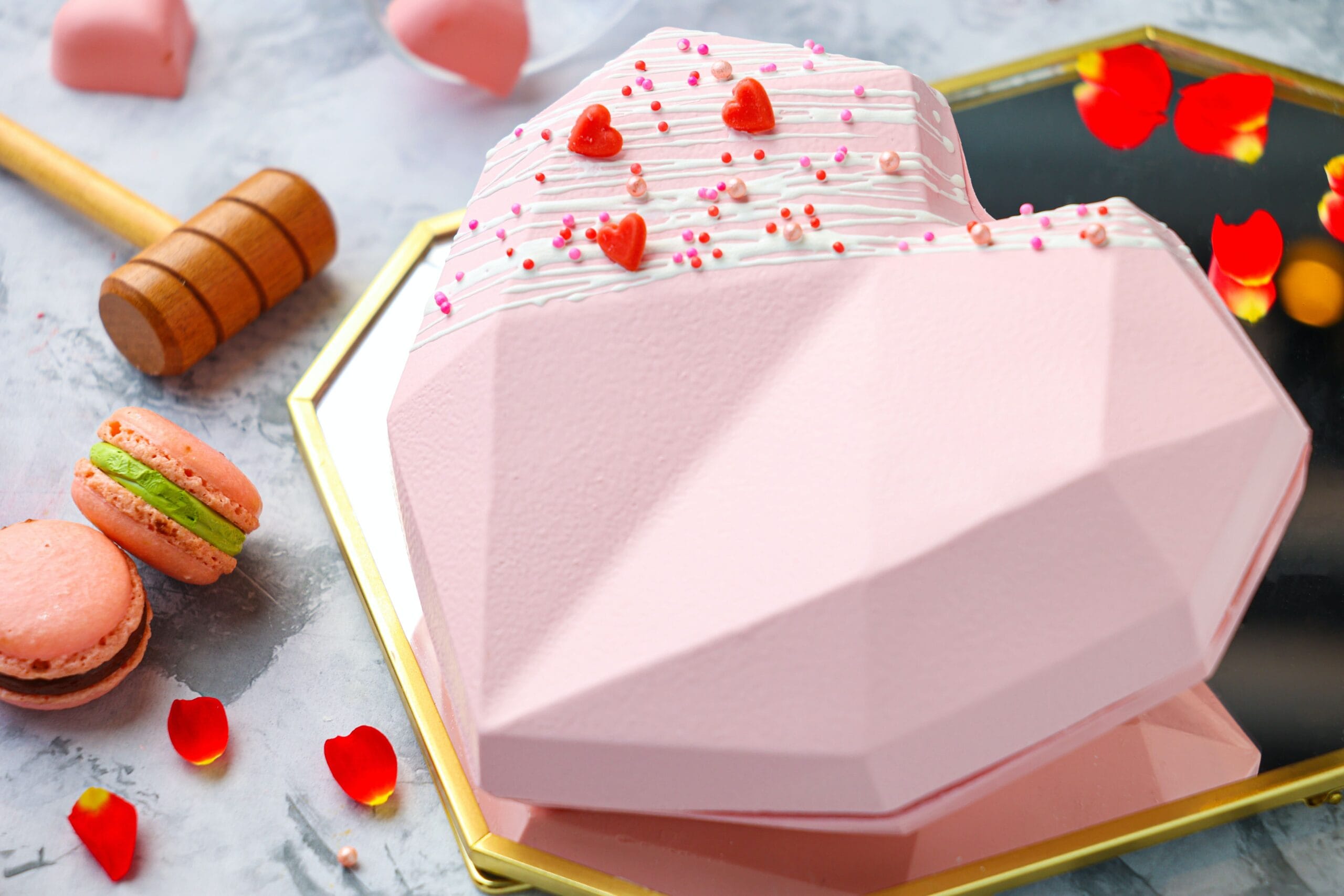 晶華酒店法籍點心主廚裴洛偉因應情人節的到來,精心打造、最有「內涵」的「敲敲打開你的心」心型巧克力禮盒,主廚將法國法芙娜35%白巧克力混合粉色、帶天然莓果香氣的紅寶石巧克力打造出心形外殼,接著於內裡盛裝一顆顆繽紛可口的法式馬卡龍。食客以附贈的精巧小木槌敲開巧克力外殼後,即可品嘗到清新爽口的檸檬、香氣迷人的香草以及甜而不膩的焦糖海鹽等三款風味的馬可龍,夢幻又驚喜的創意之作,必能擄獲戀人的芳心,每組巧克力禮盒含乙支精緻小木槌,售價1,499元。