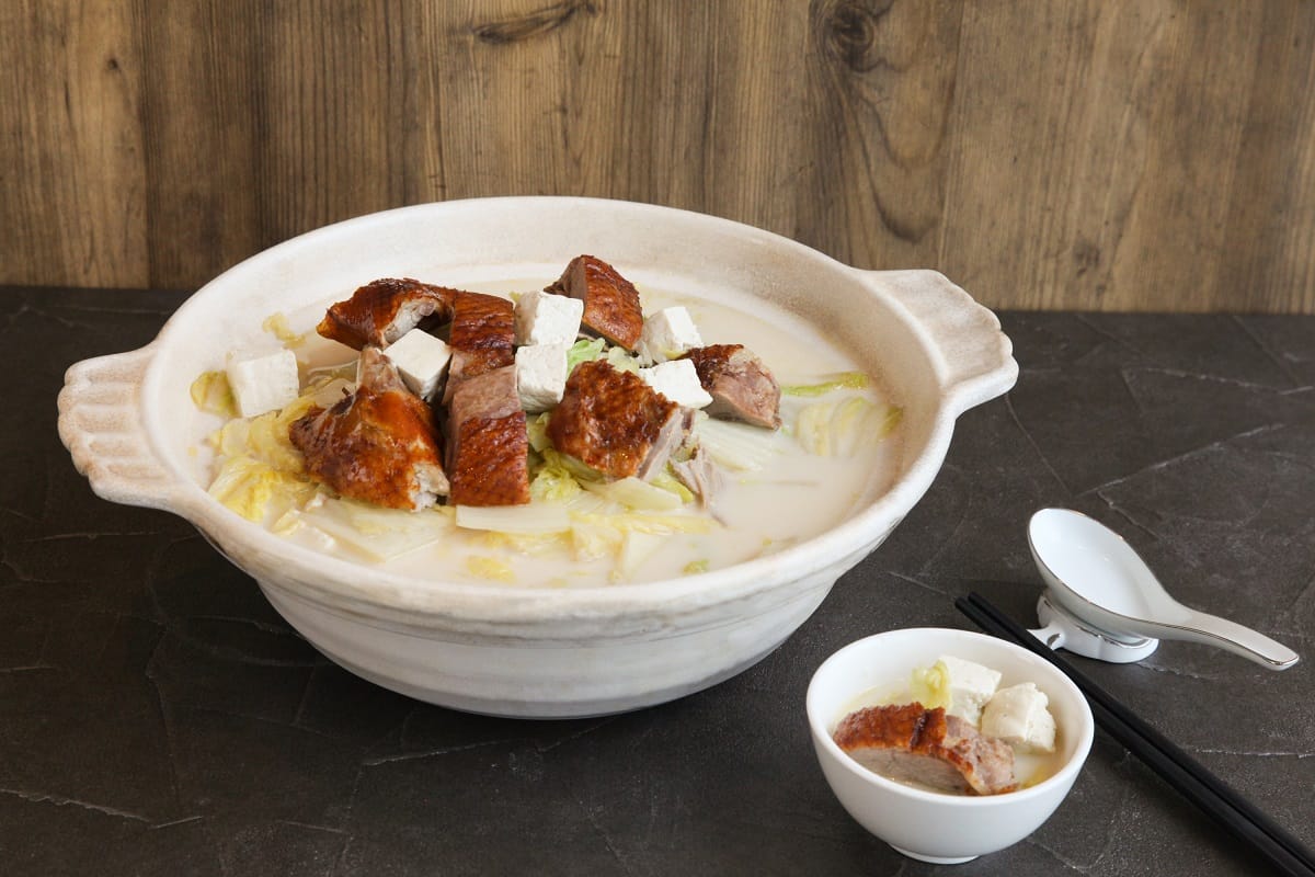 「津白鴨架豆漿湯」則是將鴨身斬件後放入熬製6小時的濃郁濃白豆漿湯中,再加入新鮮大白菜與板豆腐,使湯頭充滿鮮甜香。而「鴨油炒時蔬」是利用烤鴨所滴下來的鴨油,搭配金黃色蒜片大火快炒當季新鮮時蔬,清脆爽口卻仍富有濃濃的鴨油香氣。「鴨香寶五品」需於三日前預訂,請洽訂位專線:02-6615-6528。
