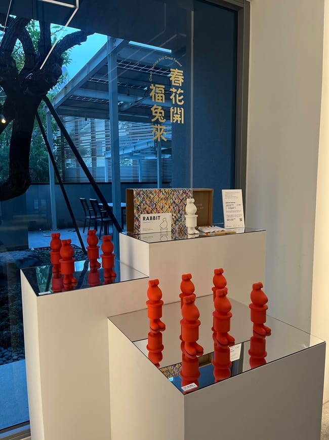 除了版印年畫展覽外,台中大毅老爺行旅更特別與學學文化創意基金會合作,為美感助學活動盡一份心力。2023年小感動生肖彩繪材料禮盒是邀請藝術家莊普老師,以<愛麗絲夢遊仙境>啟發,將故事中的兔子做為原型,想像魔術師從禮帽中變出一隻活蹦亂跳的兔子,同時也象徵著走過疫情,迎來嶄新健康的生活,創作出「感動兔」素坯。為推廣此次公益禮盒活動,在飯店內也延伸莊普老師的設計概念,打造了直立式西洋棋盤,感動兔靈動的在棋盤上躍動。
