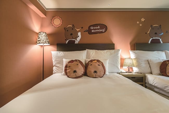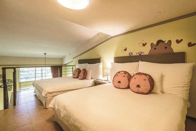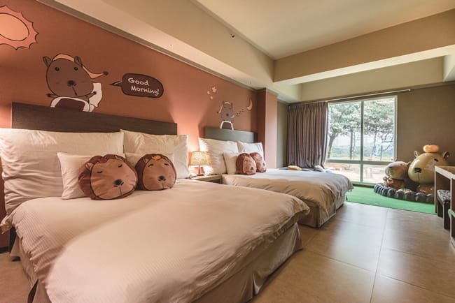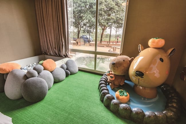 獨家設計全台唯一的「福豚泡湯趣主題房」,有剛果房及肯亞樓中樓房,每種房型限量2間,讓旅客全天候都能感受水豚的療癒魅力,取名「福豚」,更象徵著能為大家帶來福氣、勇氣和運氣。尖叫聲!打開「福豚泡湯趣主題房」讓大小房客皆興奮不已,飯店真的太懂旅客的心,從牆壁彩繪、床上擺飾抱枕和大小玩偶都是Q版福豚,剛果房今年還特別設計福豚在泡湯的呆萌樣,另一旁還有球池供小朋友玩耍,讓孩子置身在美好童趣的度假氛圍。肯亞樓中樓房設有寶貝們喜歡的帳篷,裡面就住了一隻大福豚玩偶。