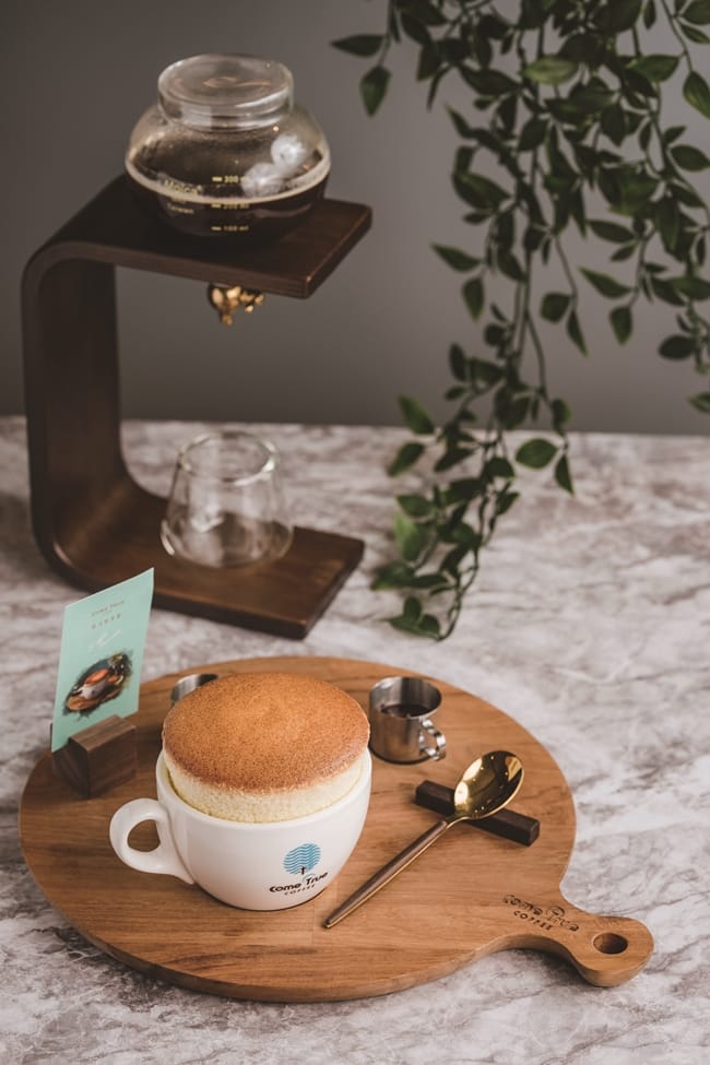 舒芙蕾是「成真咖啡」的明星商品,Endy笑說有粉絲稱「成真咖啡」是被咖啡耽誤的舒芙蕾店,同樣在這裡也可盡享這蓬鬆柔軟的濕潤口感。《法式舒芙蕾》好吃秘訣在於使用日本紫羅蘭特級日本粉、義大利Ricotta Cheese製作,加糖調配出完美比例,現點現做現烤需等候約20多分鐘,附上手工熬製的藍莓和覆盆子果醬,一次享受三種風味層次,等待絕對值得。