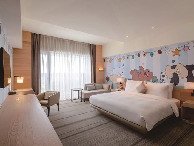 飯店規劃2層樓共54間卡通明星主題客房、1間主題餐廳,以及重現部分卡通場景的室內遊憩區與多功能空間,卡通明星們更巧妙地融入既有的500坪戶外奇趣操場上的小火車、電動車、戲沙池、噴泉池和氣墊城堡等設施,讓大小朋友們感受與喜愛的卡通明星們一同度假的歡樂氛圍。