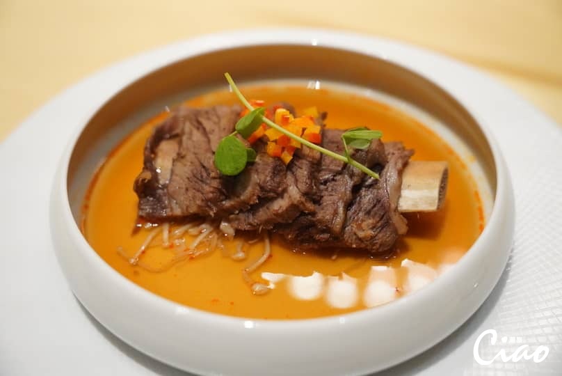 一盤來自澳洲的烤龍蝦,很有可能是你人生中最大、最完整的一尾龍蝦,巧妙運用烤的方式來保留龍蝦的原味,增添炭火的香氣,並撒上鮭魚子,讓其鮮味及鹹味帶出龍蝦濃郁的香氣,Q彈的口感讓人吮指回味。以爐煮的方式處裡美國和牛,有別於煎牛排的香脆,用更內斂的方式來呈現和牛的美味,均勻的油花讓和牛入口即化,入味的烹調方式儘管不沾任何調味料,也能體會到醬香與肉香的結合,是最能展現和牛的表現方式之一。