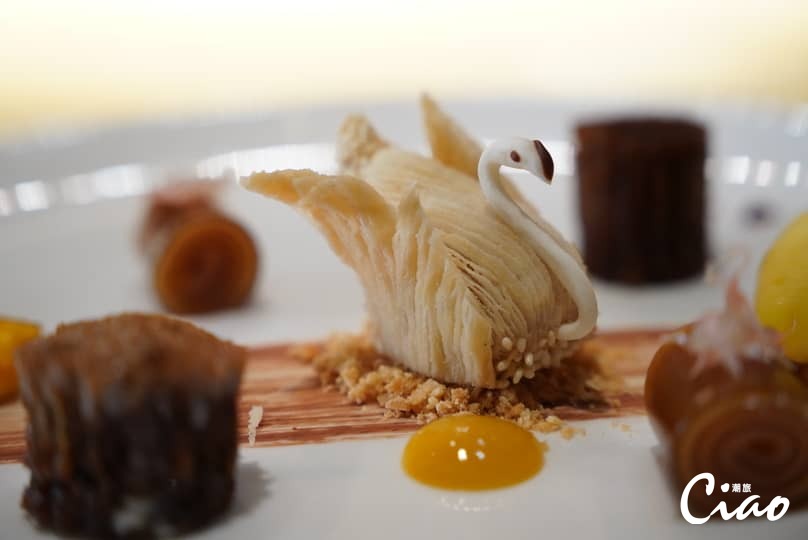 在最後的甜點拼盤勢必會大吃一驚,做得栩栩如生的天鵝造型酥餅,用馬尼拉當地新鮮的芒果醬作為點綴,目不暇給的視覺效果,就如同RedLantern一樣令人驚豔,而華麗的外表之下,內藏細緻且均勻的味道,天鵝酥裡用草莓與香橙配搭,甜、酸與橙皮微微的澀感合而為一,配上酥皮本身的香氣,打造中式甜品的全新印象。