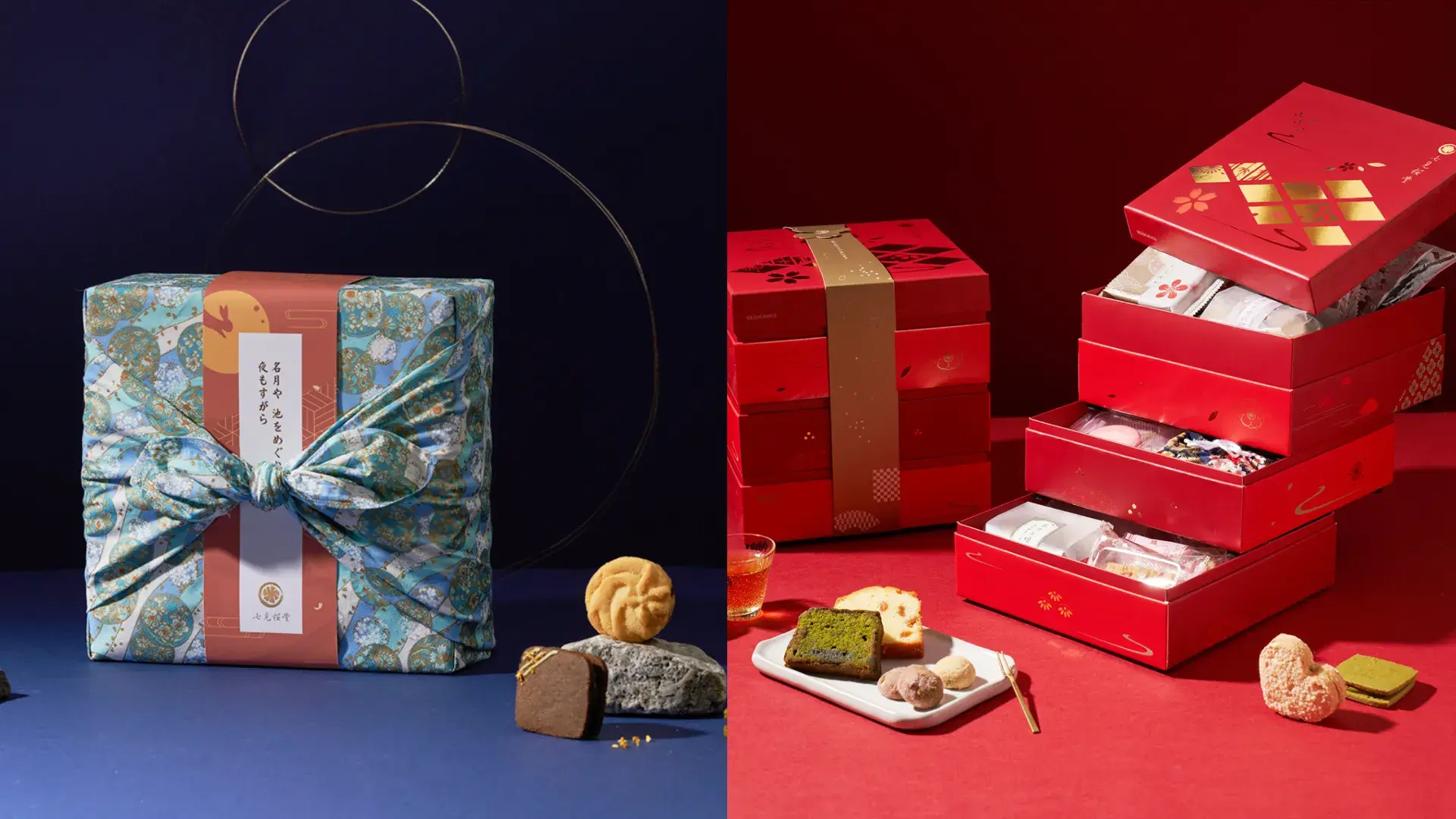 七見櫻堂全新推出佳節送禮首選—「赤岩最盛角皿」,紅金色贈禮大氣高貴,嚴選多種限定夾心甜點及常溫燒菓子系列,包括三明治餅系列、馬卡龍、磅蛋糕、塩味菓子系列,並提供多層組合可自選搭配,將層層心意典藏其中。