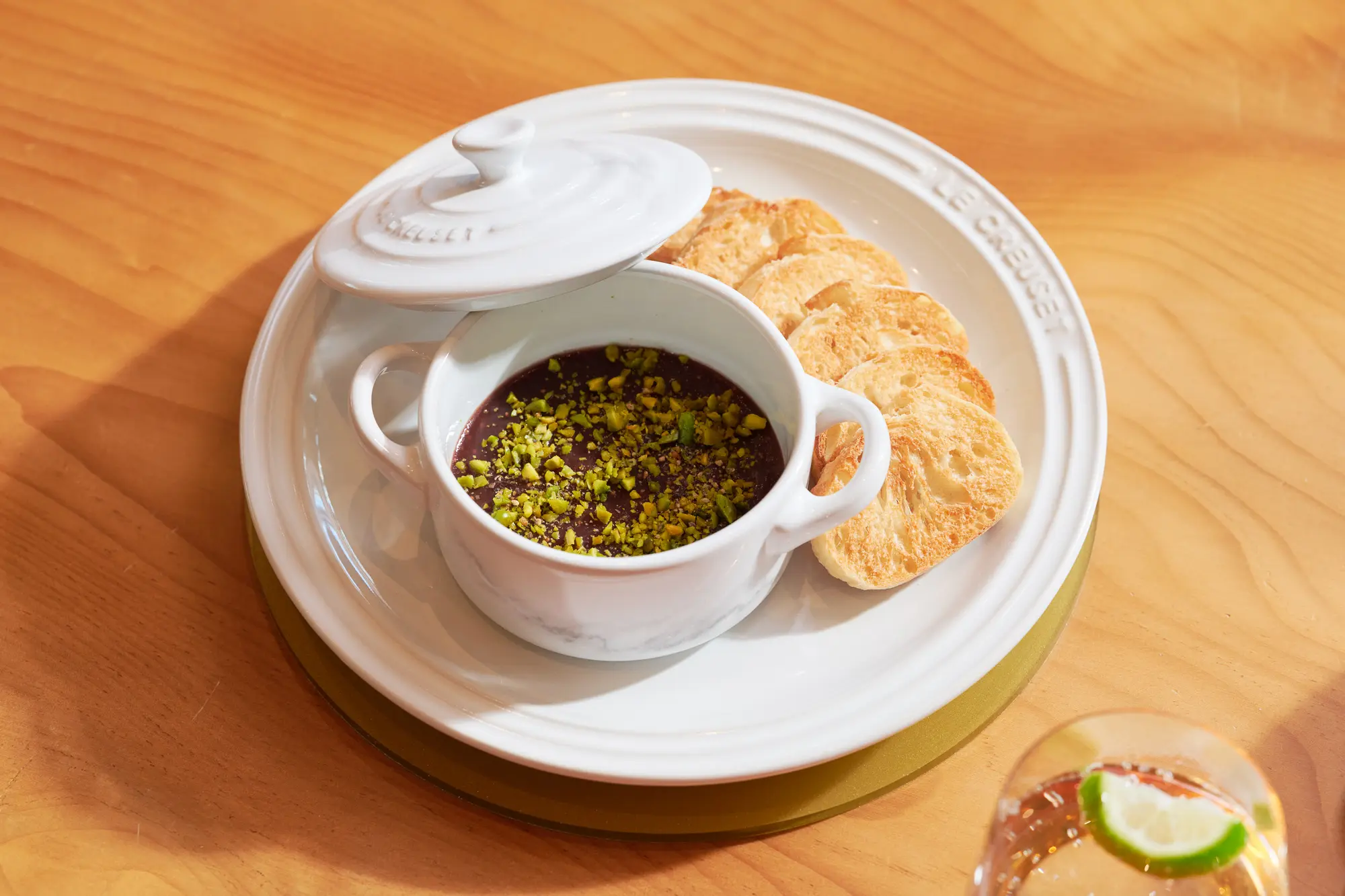 以LE CREUSET烤盅呈現,濃郁的雞肝醬搭配波特紅酒凍與開心果,口感層次豐富,搭配香脆法棍麵包片,入口綿密,香濃原味在嘴中散發。