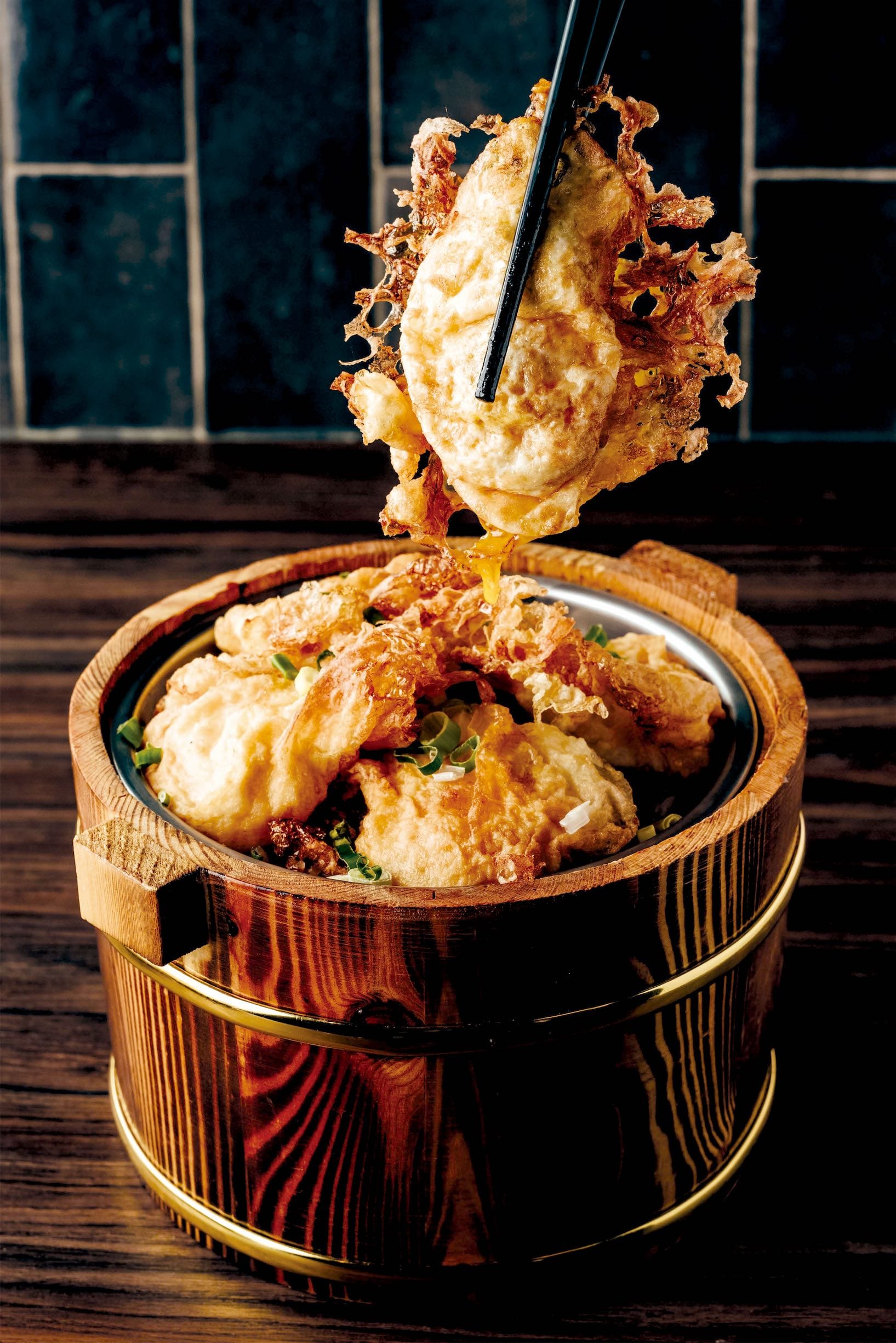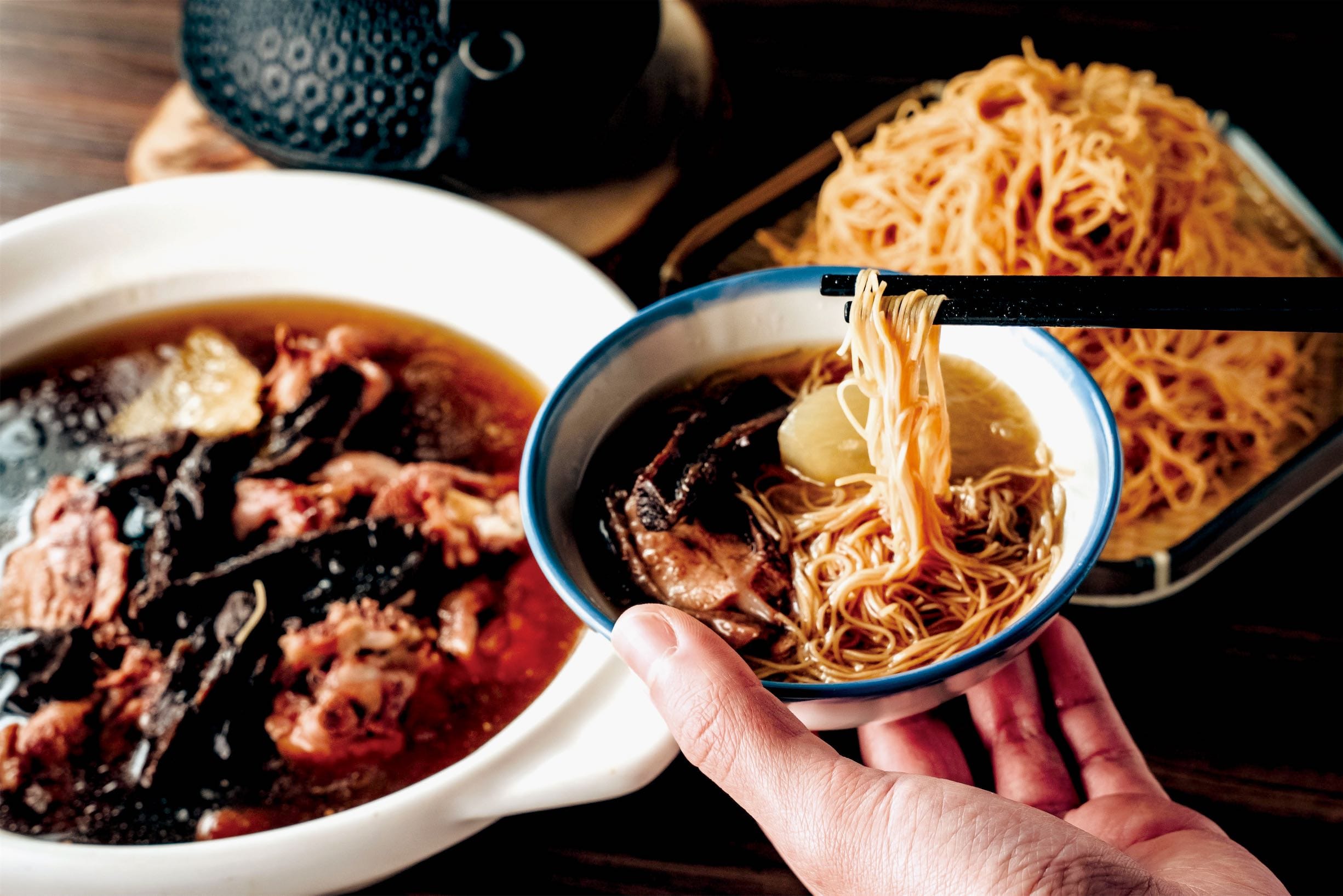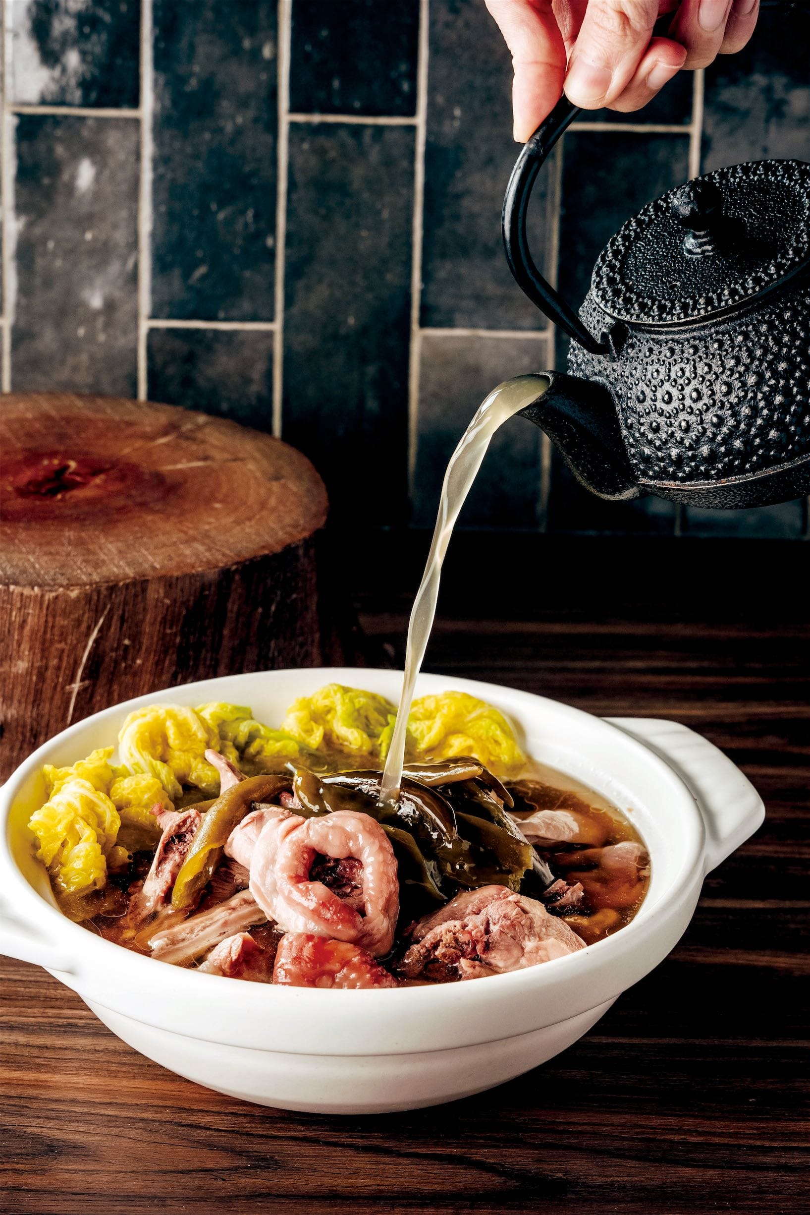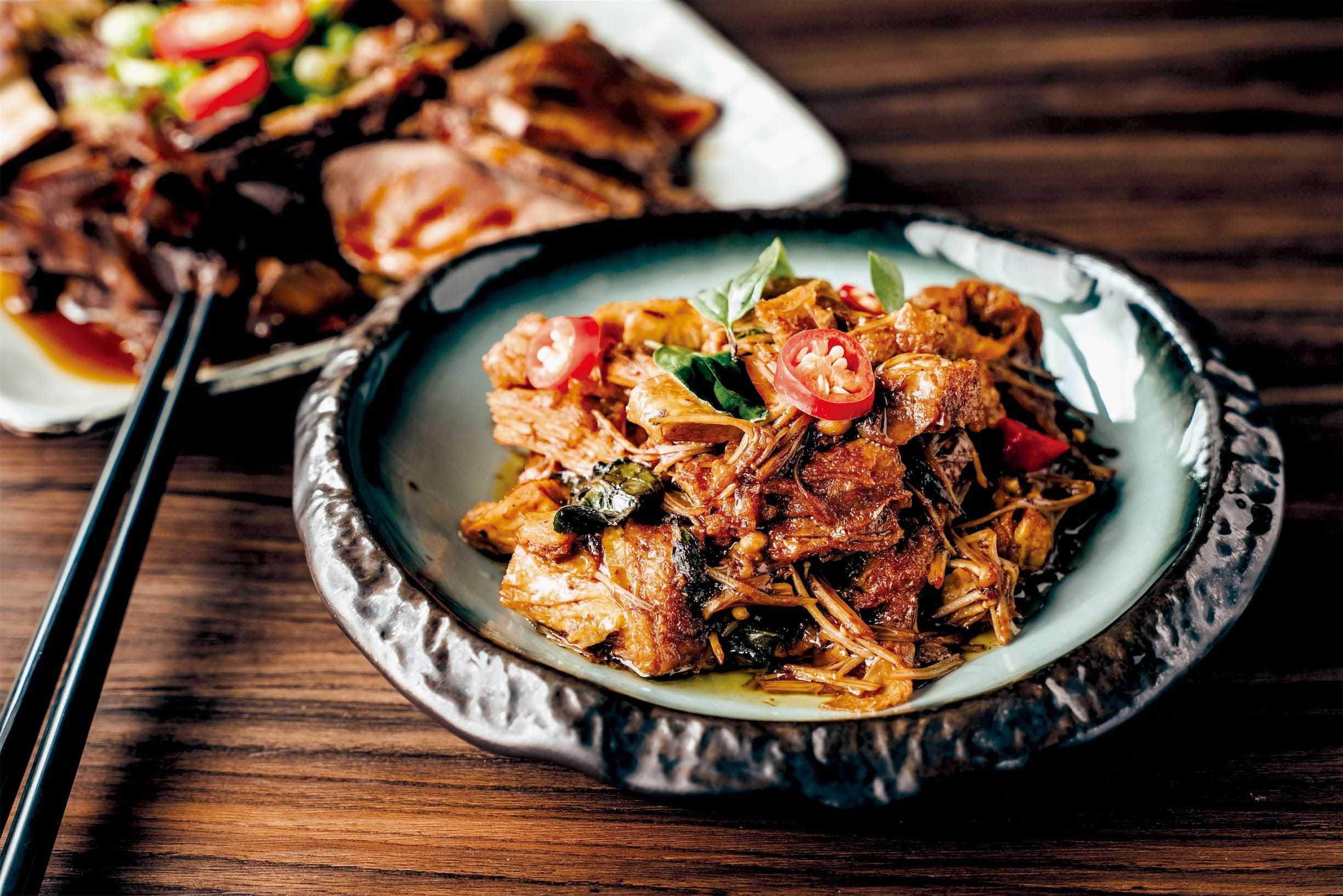 砂鍋菜「土魠魚白菜滷」,南部的作法,融入土魠魚、白菜滷,料理味道有層次、滿滿鮮甜好味。「丰盛町」向來最受歡迎的砂鍋湯,此次新推出的「老菜脯雞湯佐雞絲麵」,時間淬鍊的陳年味,溫補食材老菜脯(醃製蘿蔔)被稱為台灣黑人參或台灣黑松露,富含豐富營養素,老菜脯其獨特香氣,不用調味即讓一鍋的雞湯更顯甘鮮味美,再加入些許新鮮蘿蔔更提味,老菜新吃法,搭配雞絲麵,是進補養生的好湯品。 「剝皮辣椒雞」,食材單純,有娃娃菜、土雞腿肉、剝皮辣椒加少許豬肚,湯頭甘甜微辣,雞肉鮮嫩可口,溫暖脾胃,提升免疫力。呷呼飽的「炸蛋豬油木桶飯」,自製提煉豬油,帶有淡淡紅蔥頭香味,香酥的炸蛋半生熟,蛋黃與豬油完美融入飯裡,看似平凡,讓人回味許久,重溫兒時的想念滋味。