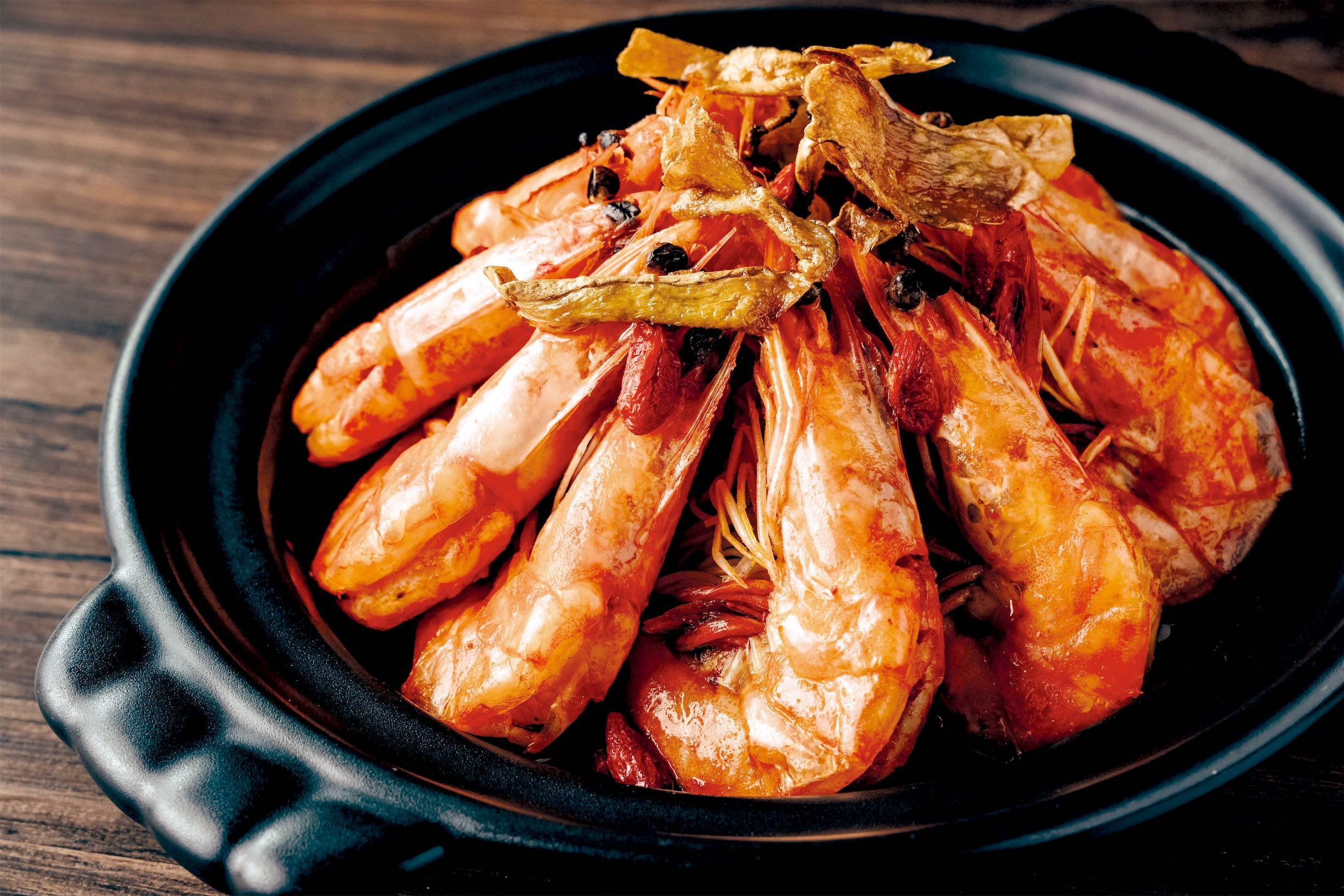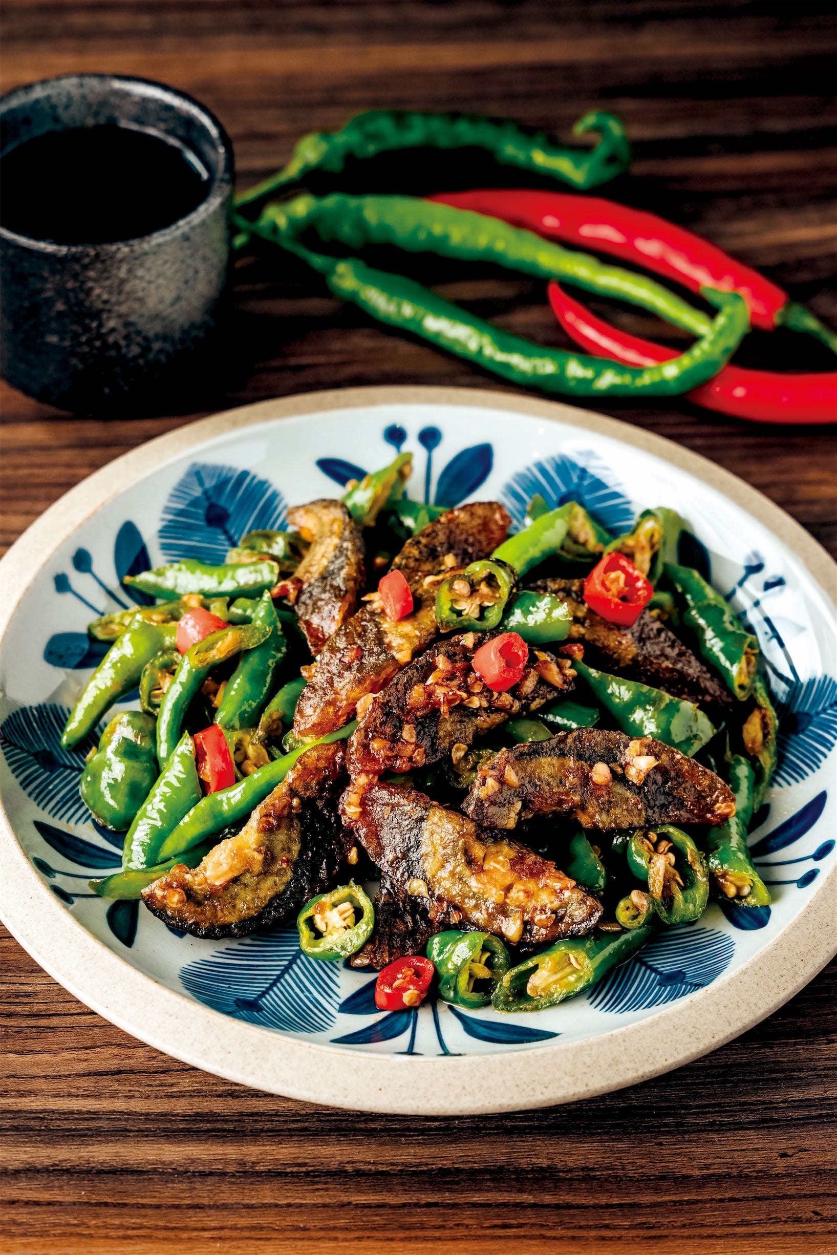 「青龍嚇皮蛋」,先用蒜頭爆香,將炸過的皮蛋、不辣的青龍椒一起快炒收汁,鹹香濃厚好下飯。
