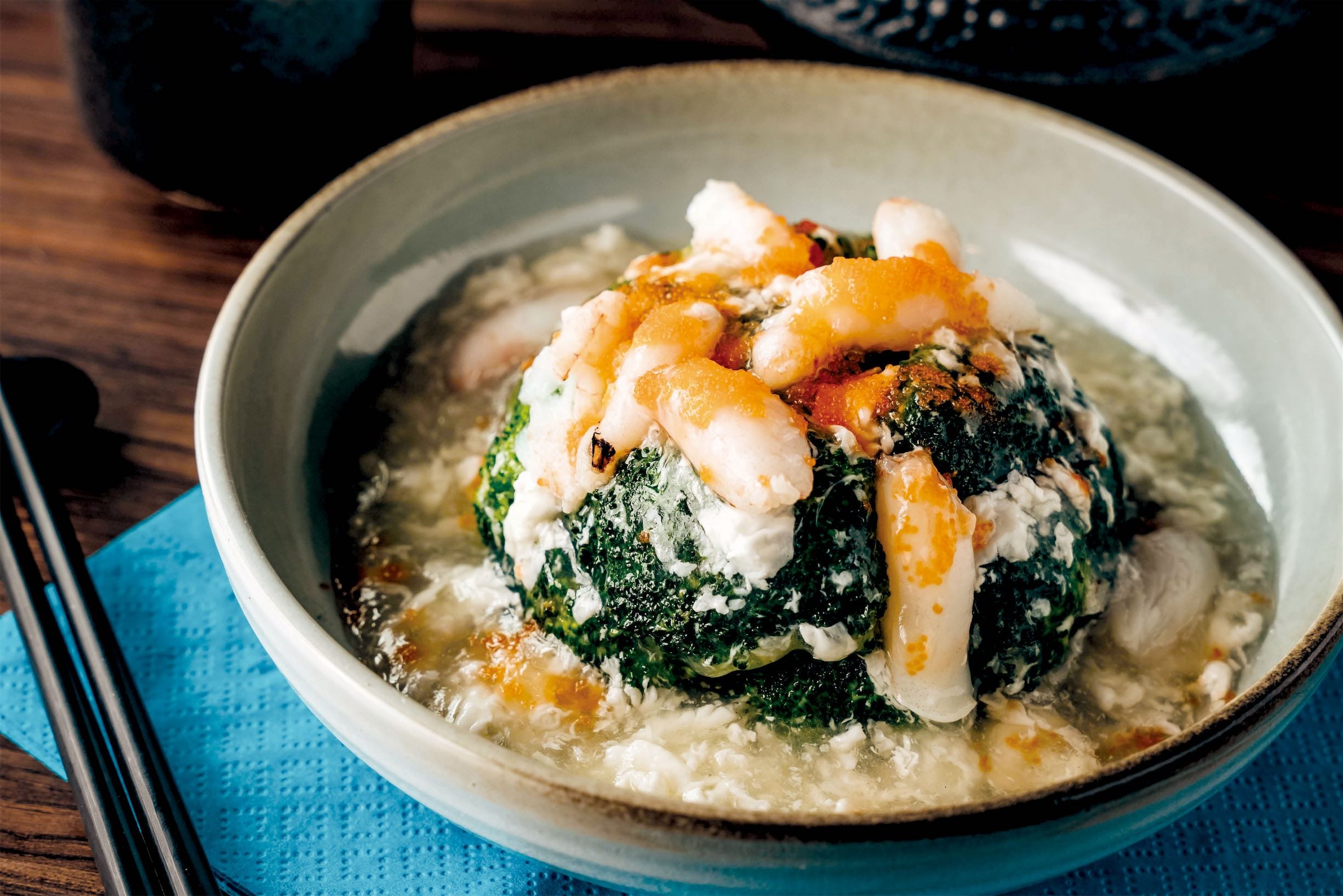 在燒煸炒燴部分,「蟹肉巴可莉」,巴可莉取自青花菜的別名,將蛋白、蟹肉打成芡汁,淋在青花菜上面再點綴橘色蝦卵,色香味俱全。