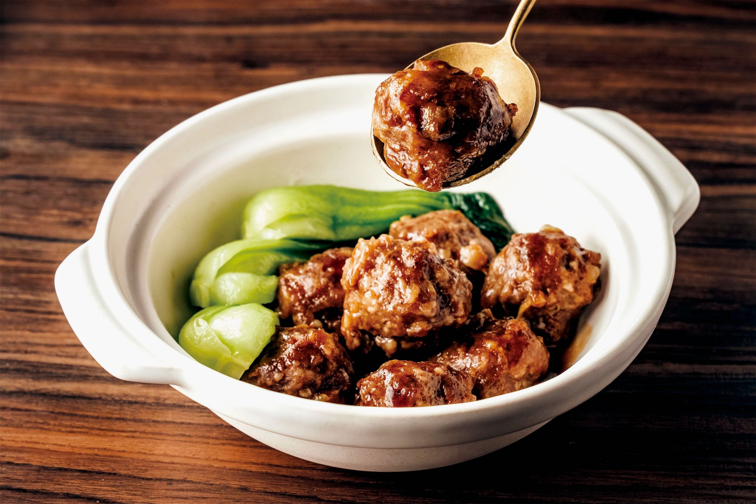 「粉蒸五香肉」,主廚以自製配方醃製豬軟骨再均勻裹上蒸肉粉,軟骨軟嫩、綿香口感,富含鈣質和膠質,讓人欲罷不能。 以蔭瓜仔肉做成的「蔭肉小丸子」,渾圓飽滿、紮實有彈性,小巧小口剛剛好。