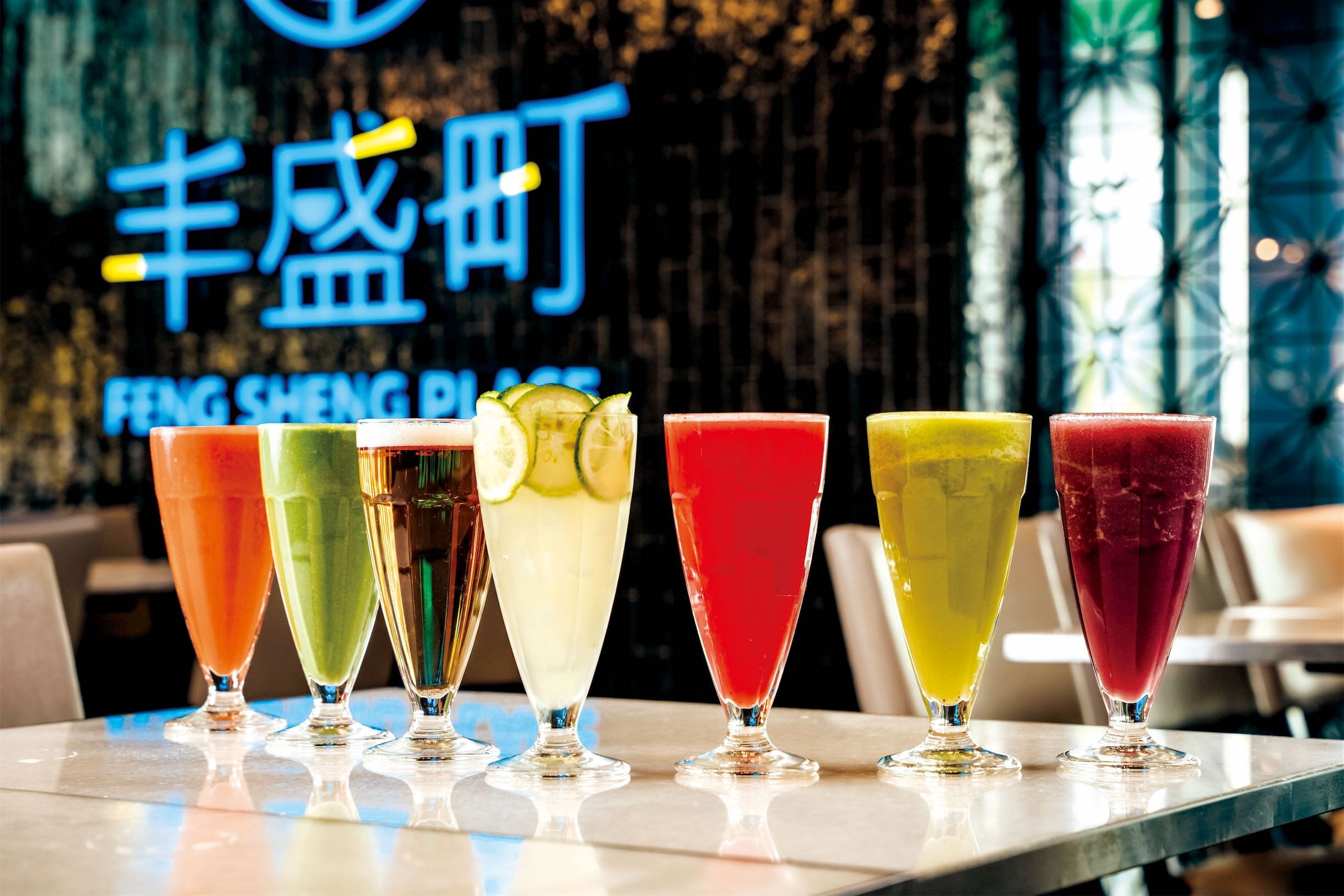 除了開胃小品、闔家菜餚、湯品、甜點外,「丰盛町」對於飲品也很講究,別家喝不到的健康蔬果汁、凍檸飲、創意茶品等,像是「擋不住旺來汁」,呈現綠色的鳳梨汁加入青江菜,富含豐富葉綠素,「不棄嫌芭樂汁」帶點紫色,原來是加了含有青花素的紫高麗菜,招牌「重磅綠拿鐵」多加了芭樂、堅果提味,含有2倍的蔬菜量,也是養生蔬果汁,喝起來很有飽足感。每道餐飲皆值得嚐嚐,絕對不踩雷,超值又滿足。