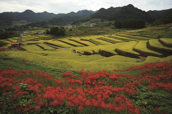 四面被山巒環繞,波佐見町是長崎縣內唯一不臨海的城市,江戶時代起就以生產「波佐見燒」陶瓷器聞名,像詩意般走進大家現代生活的日常。同樣是江戶時代建成的鬼木水稻梯田,被選為日本100個最佳梯田之一,適合觀賞時間是在5月至10月,夏季時,梯田變成茂密連綿的綠色田野隨風搖擺,映襯著藍天和白雲。到了秋天,鮮紅的龍爪花(石蒜)盛開了,花梗長又直,花瓣具有波浪般的弧度,與水稻梯田黃綠相間的稻穗組成的生動景觀、非常壯麗,每年9月波佐見町還會舉辦梯田祭典,約一百個獨特的稻草人表情動作誇張,也是登場人物之一,遊客充分感受與體驗日本鄉下的原始景觀,是那麼地純粹與樸實。