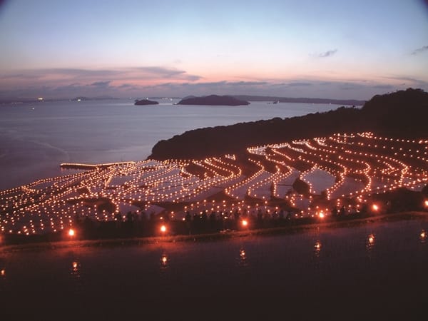 在日本〝棚田百選〞中被評價為首屈一指的「土谷棚田」就在松浦市福島町,擁有美麗曲線的梯田延伸至海岸邊,是日本最優美壯觀的稻穀梯田之一。於每年4月中至5月初的插秧季節,伴隨著落日西下,約400塊的水稻田與大海結合成一面鏡子,在夕陽餘暉映照下,把梯田變成橙色,格外顯得閃爍耀眼,與落在海洋中的島嶼影子,交織成深刻動人的景致,吸引許多攝影愛好者及網美前來取景。更不能錯過秋天舉行的「土谷棚田火節」,在梯田裡點亮3000支火把,當夜幕降臨時,閃爍在棚田間的燭火產生一種懷舊感覺,使人完全沉醉於夢幻般的大自然情境中,忘記了時間的流逝、捨不得離去。