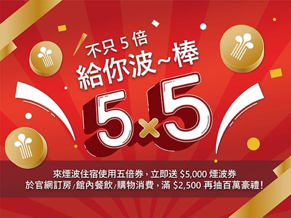 超殺加碼抽煙波百萬豪禮!全集團免費住宿、煙波早堂神卡爽嗑五年