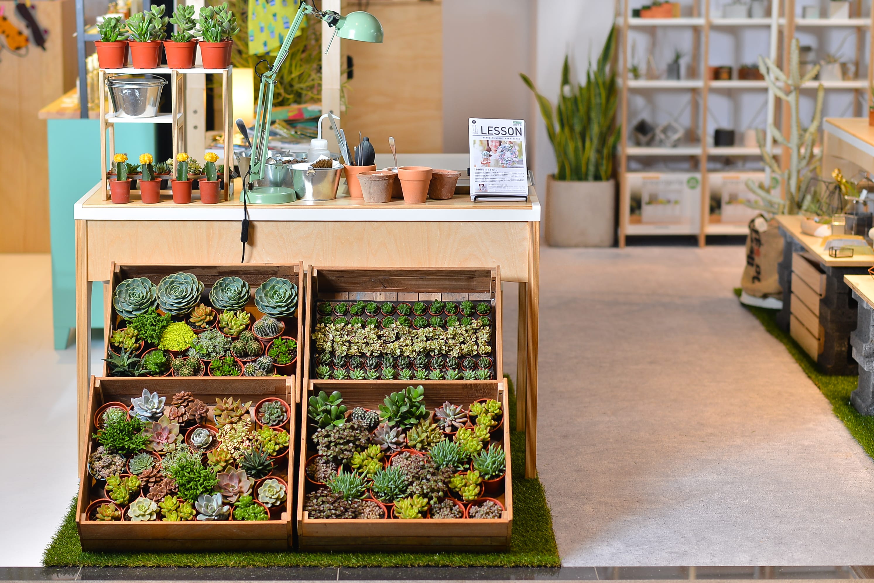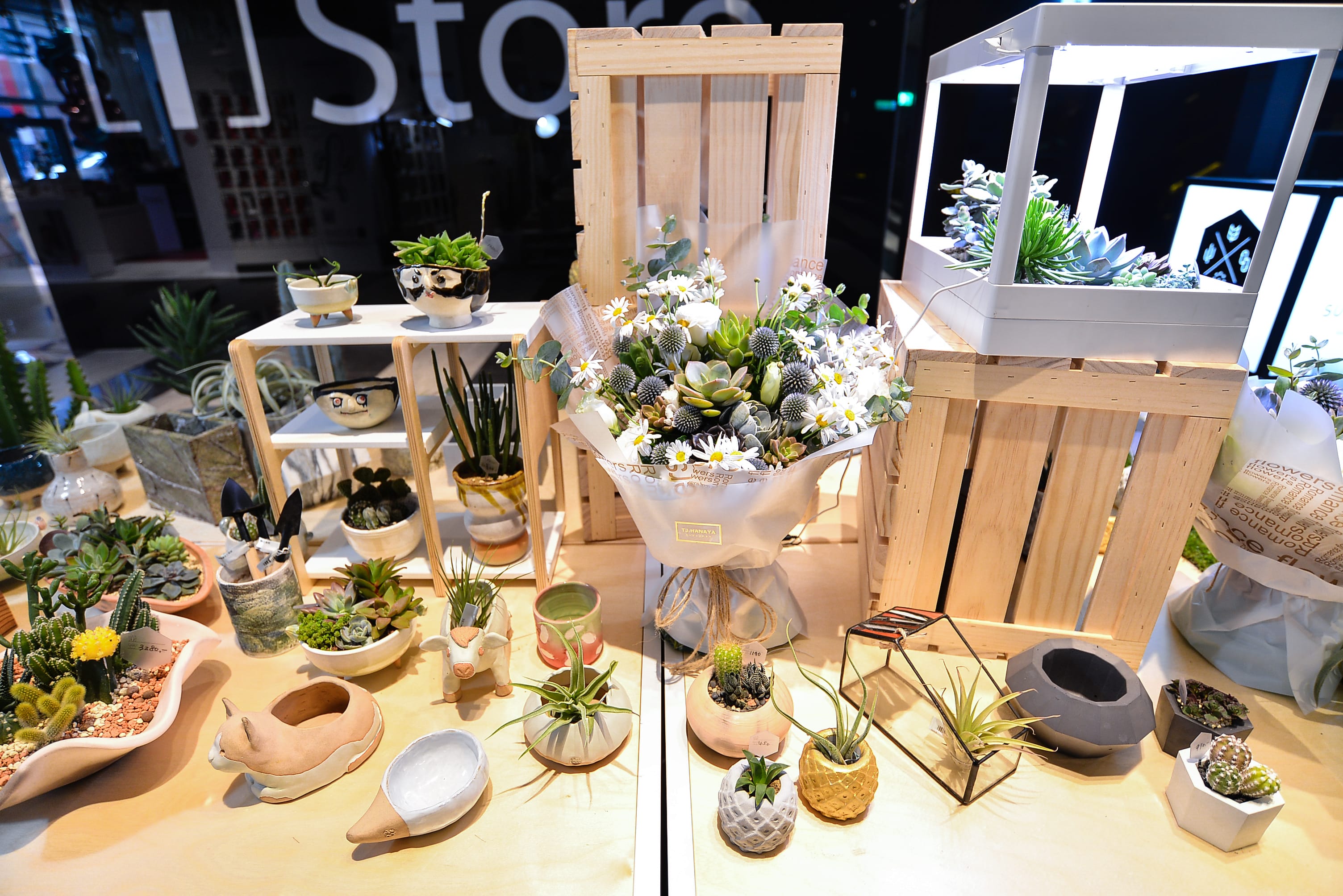 現場除了可以直接購買設計植栽禮品,更規劃客製化種植的組盆區域,將有肉完整服務搬到百貨,快閃期間限定販售「多肉花束」,多肉花束的特點在於生命可以延續,當鮮花凋謝,將多肉植物移植進盆器內,延續花束的美麗與蘊含的祝福。