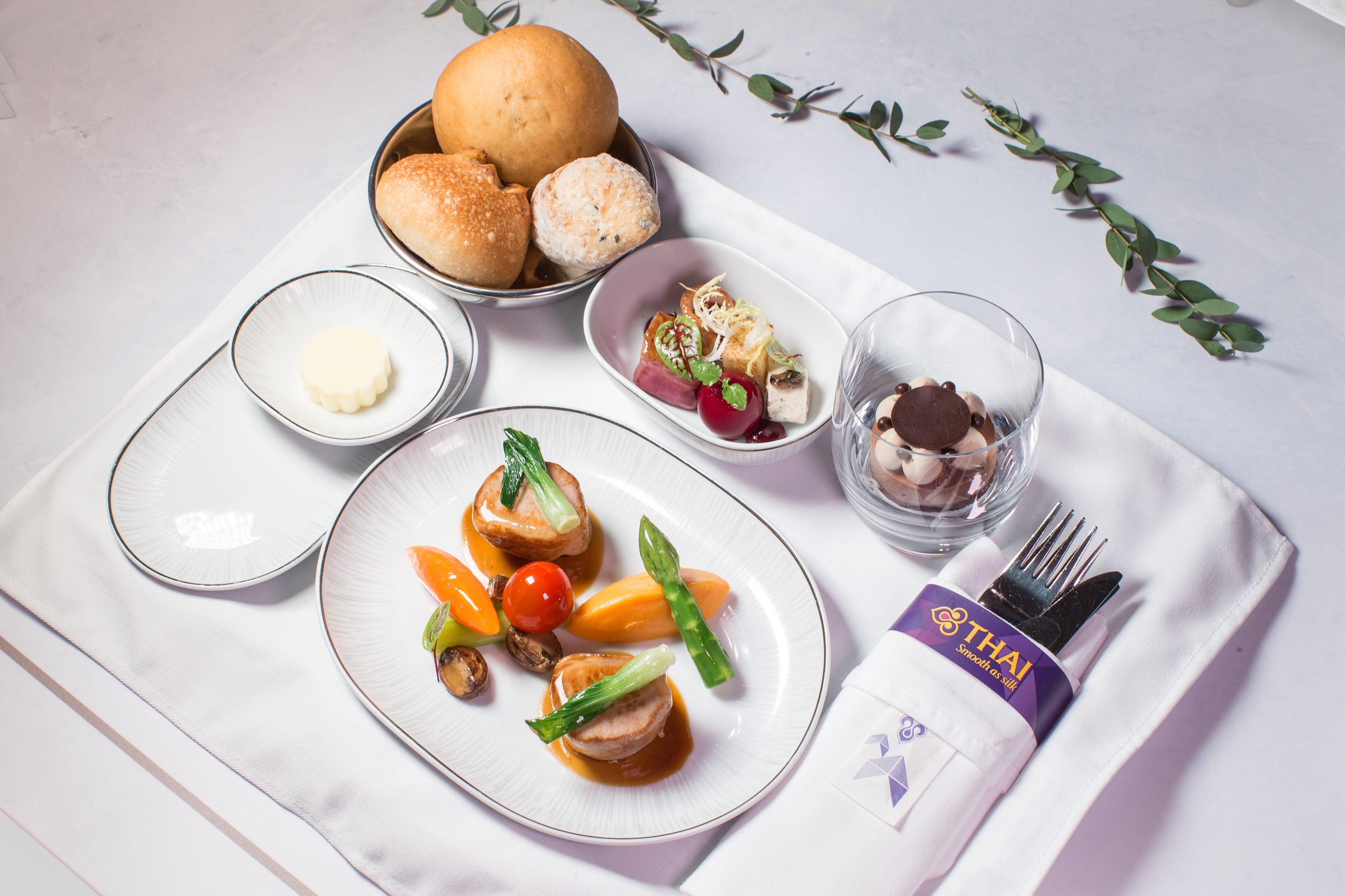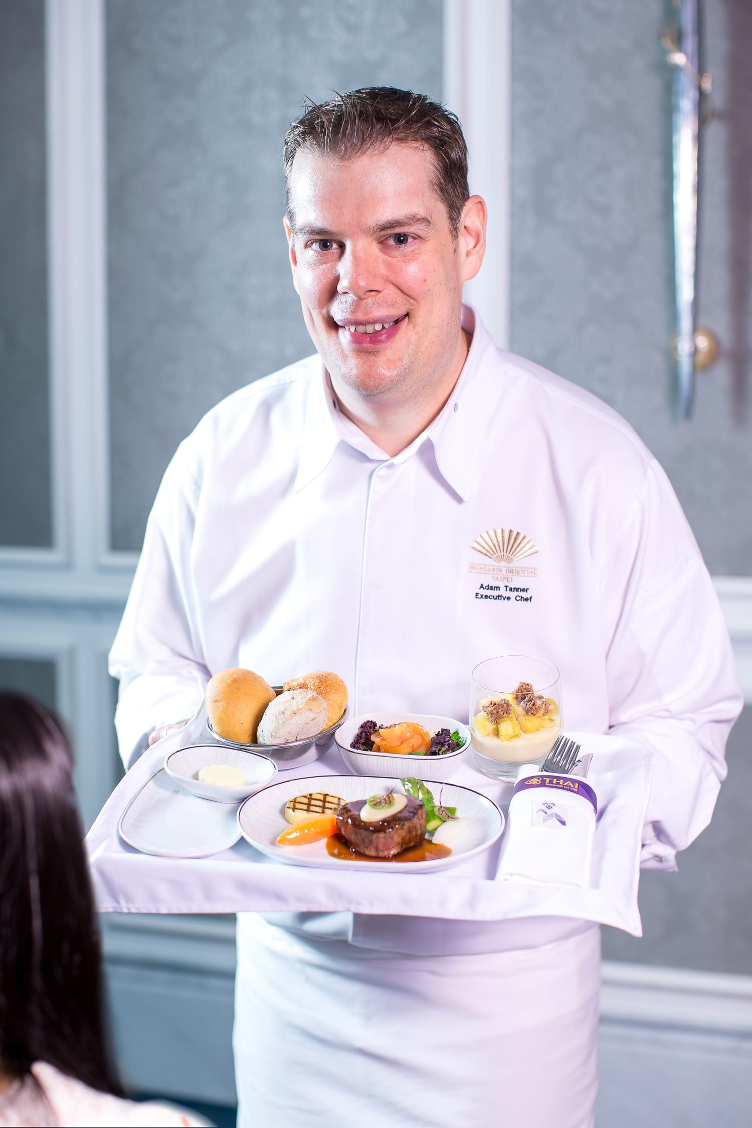 泰國航空以其充滿泰式美學且細緻用心的服務與機上佳餚著稱,此次特別跨界邀請台灣觀光旅館界領導品牌-台北文華東方酒店合作,由其美籍行政主廚亞當.坦納 (Adam Tanner)領軍,匯集米其林一星餐廳雅閣主廚-謝文和米其林推薦餐廳Bencotto國際級專業廚藝團隊的巧思,運用上乘食材精心規劃出6套不同凡響的中、西式機上佳餚,以輪替方式供應,滿足所有國際旅客挑剔的味蕾,讓旅客於3萬英呎的高空盡享細緻舒心的服務與精心規劃的機上餐食,成就最優質且星光熠熠的空中餐飲服務!