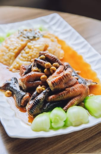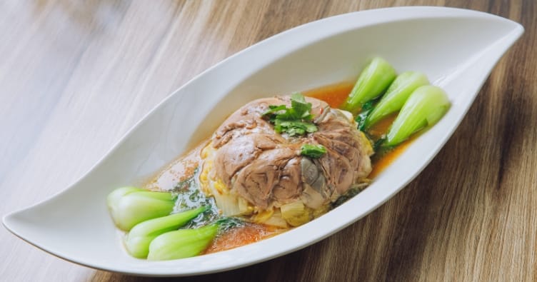 延續傳統台味卻不受框架束縛,「羊腩白菜」完美詮釋,嚴選羊腩及羊腿肉打造雙重口感,經由川燙、醃料、滷製等多道工序,腥羶味消失於無形,結合台灣大街小巷都吃得到的銅板菜色白菜滷,「燉到軟嫩卻又不能過頭,這是沒有SOP,完全靠師傅經驗累積。」出餐前兩者再結合蒸煮,運用原湯化原食概念,將自然釋放的湯汁調味後回淋出餐,成為啟動美味關鍵鑰匙,鹹香濃郁後盡是滿口甘甜。如果說羊腩白菜讓白菜滷從街邊小食躍升成為五星料理,「鳳爪苦瓜」就是將苦瓜從家常媽媽味,華麗變身成頂級食材,嚴選無農藥的有機白玉苦瓜與腳掌肥厚的土雞雞腳,以老滷燒得透嫩,清心解熱揉合綿密膠質,互不搶戲,再添加小魚乾、破布子,勾勒出樸實醇美的台灣味,貌似家常卻展現味蕾奢華感,重新演繹傳統老菜,讓長輩邊吃邊追憶韶光年華,分享人生故事,游岳璁總經理感性的說「有故事的料理最美味」。