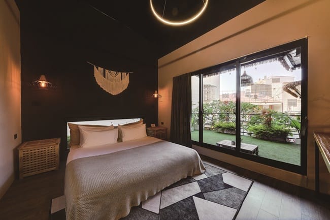 雖然不是科班出身,但兄弟倆對室內設計很有興趣,加上時常出國,深知旅客需求,因此大方地留給旅客超寬敞、無拘束的休憩空間,只設計雙棟挑高的樓中樓房型,每棟閣樓只接待1組客人。園景露台閣樓King Terrace Loft(2人閣樓),約18坪,整體採開放式空間,一樓擁有各自獨立的淋浴間、洗手台、廁所及小客廳,特別得是電視用投影方式,就像是小型電影院,喜歡追劇者,etflix無須帳密登入可直接觀看。二樓臥室為一大床,踏出落地窗外有私人露台及吊椅,可閒坐於此發呆、小酌,欣賞府城街景。