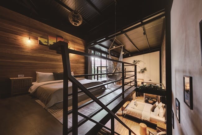 一眼就會愛上,每個角落怎麼拍都美的豪華庭院閣樓Deluxe Garden Loft(2∼4人閣樓),約22.2坪,適合雙人、也適合家庭度假。一樓的四柱床與床背面紅磚牆是焦點,寬敞客廳有大冰箱、電視也是採投影方式。推開全開式折疊門,仿清水模質感的浴室,搭配白色橢圓形人造石浴缸,一邊泡澡即能享受戶外庭院景致。二樓還有一張大床、吊椅,延伸樓地板上擺放兩個懶骨頭,坐在此看看室外風景,尤其是夜色中的庭院,當一盞盞的燈泡亮起,這夜晚更迷人了。