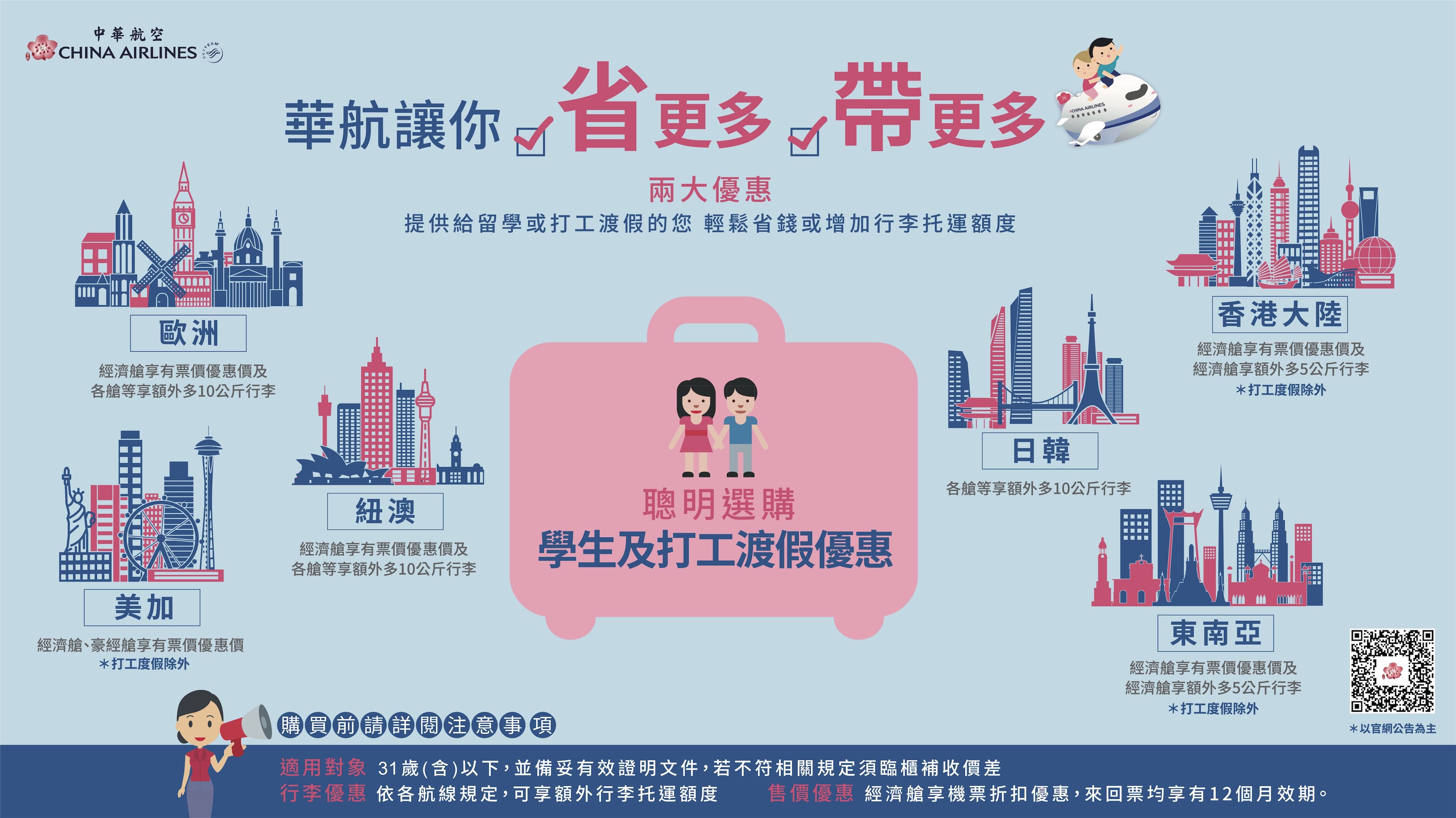凡31歲(含)以下,備妥有效學生身分證明或打工渡假簽證文件,依各航線不同可享受機票折扣優惠或享額外行李托運額度。售價優惠含:台灣出發之紐澳、歐洲、美加、東南亞、大陸香港等航線,單程/來回之經濟艙/豪華經濟艙(僅限北美航線適用)享折扣優惠,來回機票享有12個月效期。行李優惠含:東北亞享有全艙等額外多10公斤行李托運額度,東南亞及大陸、香港享有經濟艙額外多5公斤行李托運額度。現在就上華航官網學生/打工渡假機票專區,聰明選購特惠機票吧! **詳情以華航官網 https://www.china-airlines.com 公告為準。
