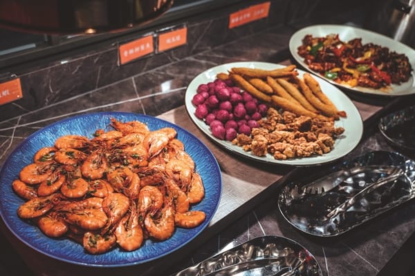 自助吧備有三款熟食區,每天變化不同口味,像是糖醋排骨酥、三杯雞、胡椒蝦、香酥柳葉魚、地瓜球等,還有曾獲全總冠軍米的益全香米,淋上濃郁巧克力豬肉咖哩,忍不住會多吃好幾碗!生菜沙拉吧有凱薩、和風、胡麻三種醬及新鮮烤蔬菜類,最讚的是為了讓燒肉有更多元吃法,黃金泡菜、醃漬類(洋蔥、南瓜、蔥鹽、蘿蔔)、蒜片等小菜搭配有一番風味。咖啡、茶、冷熱飲料機台更是多達6種,甜點有茶凍、奶酪與法式香草霜淇淋,這一季特製仙草口味,可以自選配料,光是自助吧一不小心就吃飽了吧!