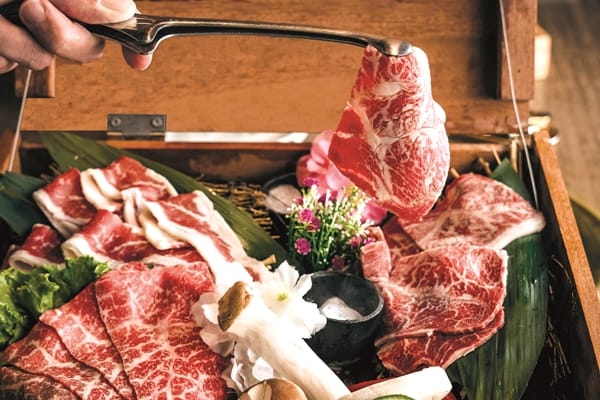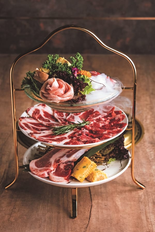 把吃燒肉當做玩樂與嚐鮮,「燒肉同話」主打各種創意料理的多種吃法,分成經典店(精緻套餐)與半自助(套餐附自助吧)餐型二種形式,新推出以月光寶盒概念的「藏馥食光饗丰饌」套餐加自助式吃到飽(限於台北南港店、桃園中正店、竹北光明店、高雄義享店),主打陸海食材的燒肉元素,藏馥寶盒盛裝澳洲頂級和牛板腱、和牛霜降、和牛雪花卡路比,一開箱,哇!瞧這粉紅豐富油花多漂亮,在烤網上滋滋作響,閃著金黃色的微焦,如奶油般絲滑柔嫩、新鮮味美入口即化。